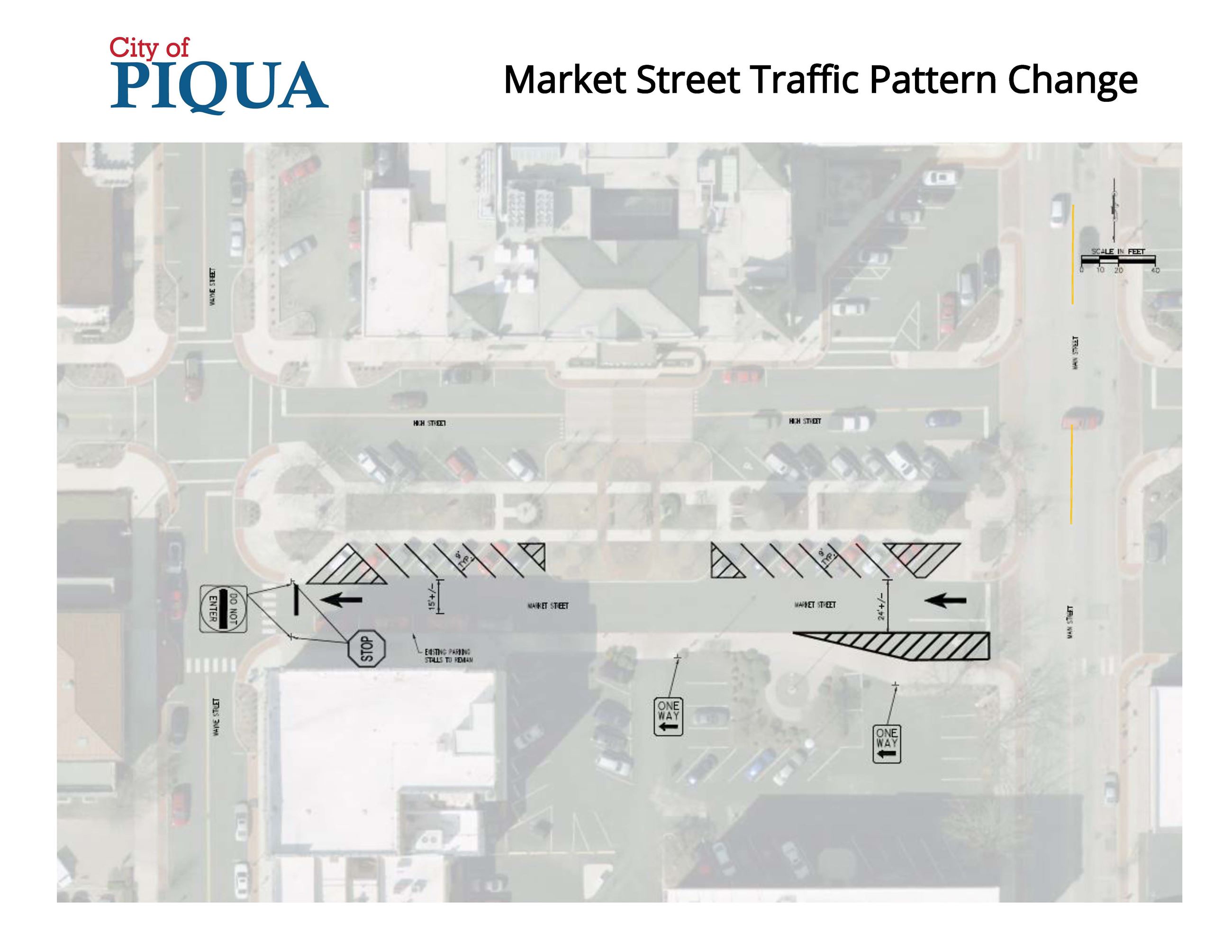 During the week of August 21, 2023, Western Ohio Asphalt will remove and replace pavement markings on Market Street and Main Street. The project will reverse the flow of traffic on Market Street and remove the median on Main Street.